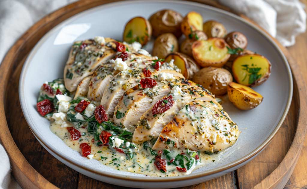 Sliced Grilled Chicken topped with a Spinach, Sun-Dried Tomatoes & Feta creamy sauce